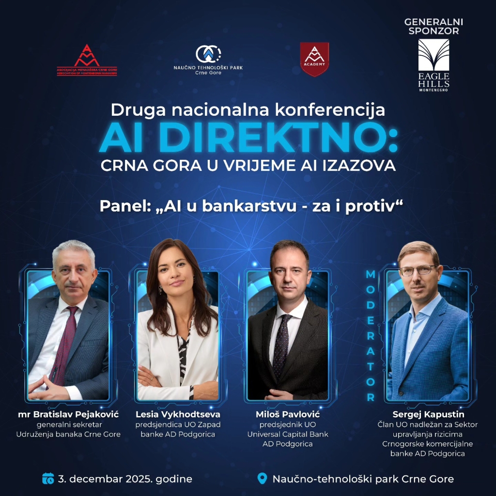 Konferencija “AI DIREKTNO” predstavlja nacionalni godišnji događaj posvećen vještačkoj inteligenciji i platformi za strateški dijalog o AI, inovacijama i ekonomskom razvoju Crne Gore, okupljajući na jednom mjestu donosioce odluka, poslovne lidere, investitore i predstavnike akademske zajednice.